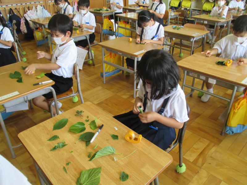 生活科のなつとなかよしの授業で、校庭にある葉っぱを使って、オリジナルの虫を作りました!