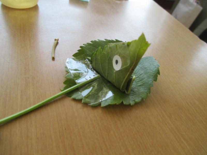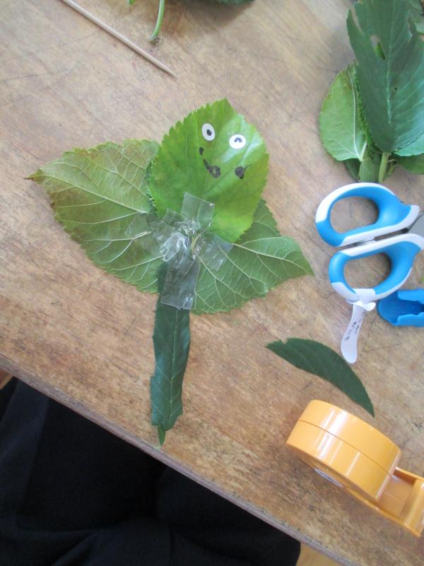 子供達は大きな葉っぱや細長い葉っぱなど様々な形の葉っぱを集めて、思い思いの虫を作っていました。