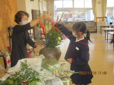 11月18日(金)に、総合「さがせ井上の〇〇名人!」の学習で田中先生と森田先生をお招きして”生け花”を学びました。グループに分かれて、花を生けて作品を仕上げました。子供たちはできた作品を見て、「すごい!」「きれい!」「家でもやってみたい!」と話していました。井上地区の名人から話を聴き、実際に生け花を体験することでたくさんの学びがあったと思います。