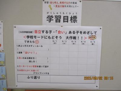 9月1日、暑い中でしたが子供たちが元気に登校してくれました。午前中だけでしたが、掃除をしたり給食を食べたり、課題を提出したりして過ごしました。始業式は暑さのため、放送で行いました。とてもいい姿勢で話を聞いている姿がたくさん見られました。先生方から子供たちへのメッセージが黒板にありました。これからの2学期元気に過ごしてほしいと思っています。