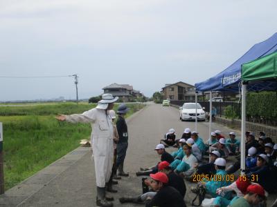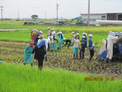 5年生が、学校田で稲刈りをしました。地域の方のご協力を得て、普段はできない体験ができました。少し暑い中でしたが、稲刈りをして休憩時間を取ったあと、落穂ひろいをして終わりました。稲刈りシーズンの大変忙しい中で、準備から後片付けまで、本当にたくさんの労力をかけていただきました。地域の方の子供たちを見守る心の広さと温かさに改めて感謝をしたいと思います。ほんのわずかでしたが、農作業を直接体験することができました。この体験をもとに学習をしてさらに学びを深めたいと思います。