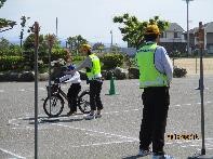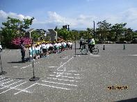 その後,児童玄関前で実際に自転車に乗り,白線で書かれた道路を