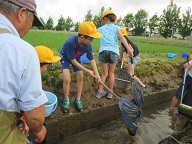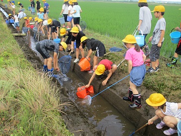 4年生が川尻地区の田んぼの用水路で生き物調査をしました。