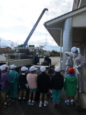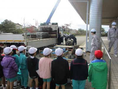 学校のエレベーター工事で使用しているユニック車を見学しました。