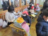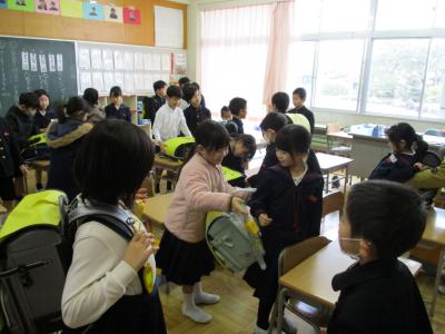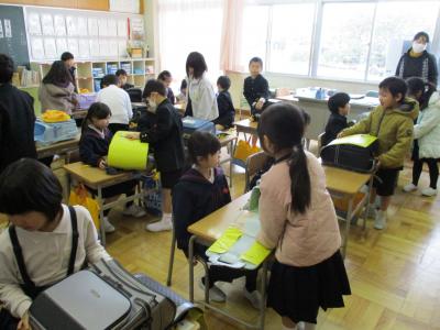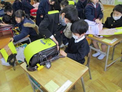 学校の中を探検したり、ランドセルを担いでもらったり、お道具箱の中身を伝えたり、絵を描く勉強をしたりしました。
