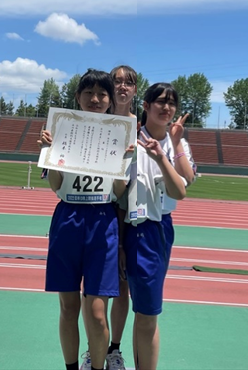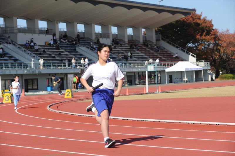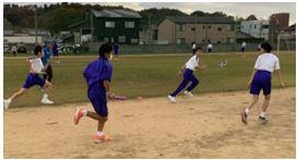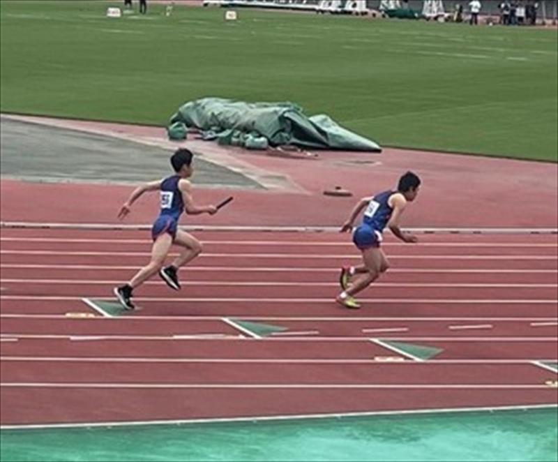 男子4×100mリレーでは、1走木越さん、2走三宅さん、3走長田さん、4走中村さんの順番に走りました。緊張感のあるレースの中、バトン練習の成果もあり、無事バトンを繋ぎ昨年度のーム記録を上回ることができました。1走木 越さんは見事なスタートダッシュを決めて次走者にバトンを繋げました。2走三宅さんはエース区間を堂々と力強く走り抜けました。3走長田さんはバトンをうまく繋げてくれました。4走中村さんはアンカーとして懸命に他の選手を追 いかけて頑張りました。