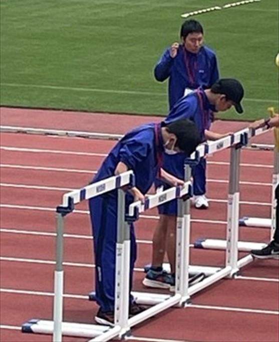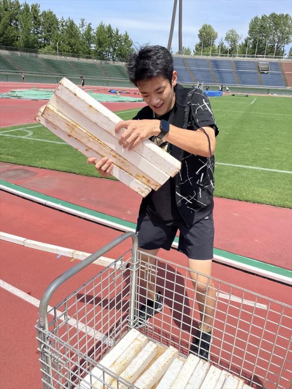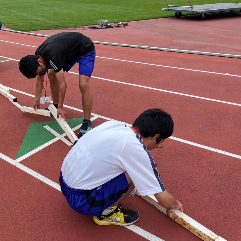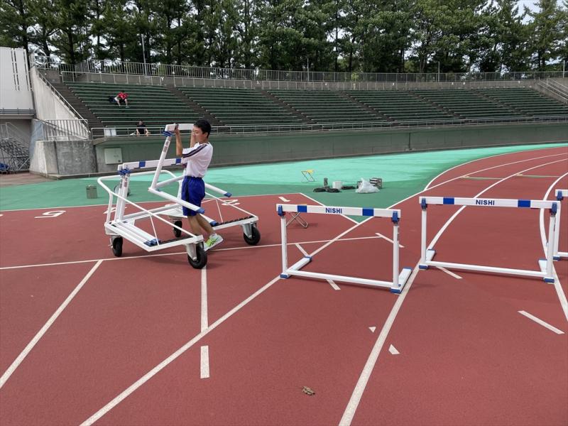 大会には3日間補助員としても関わりました。ハードルの出し入れやテントの設営、グループスタートをする際に必要なブロックの設置等、競技の運営になくてはならない役割を責任もって果たしてくれました。時間を守って行動する、手順に従って用具を準備する等普段の作業学習等でも学んでいることが活かされました。