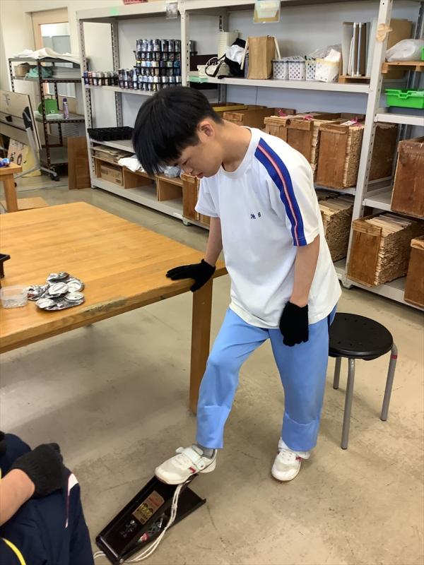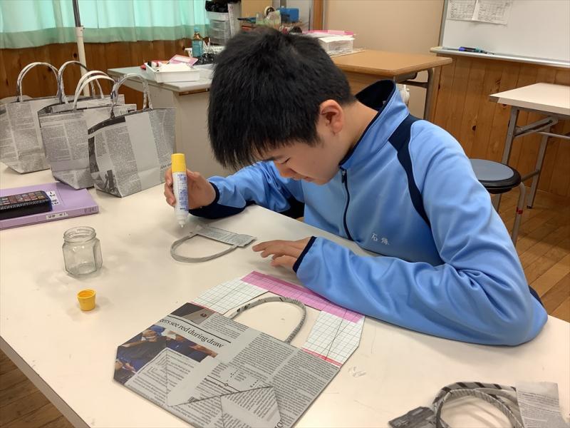 給食の牛乳パックを材料とした紙すきや紙製品づくり、アルミ缶のリサイクルや英字新聞を再利用したエコバッグづくり、畑での農作業や校内クリーン&グリーン活動などを通して、各教科の内容を合わせて学び、将来の働く力を育成しています。販売委員会が中心となり、定期的にB中ショップを開催し、作業製品を販売する活動も行っています。