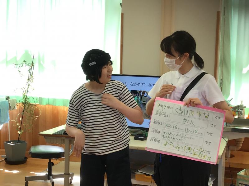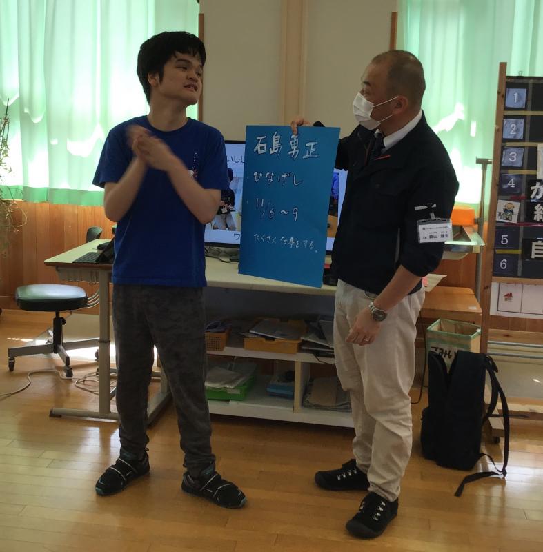 肢体不自由教育部門高等部では、10月16日(月)から後期の職場実習が始まりました。3年生にとっては、卒業後の進路に向けた「まとめ」の実習ということもあり、生徒一人一人が実習に向けて真剣に目標を立てました。 10月2日(月)に行った実習生を励ます会では、自分で決めた目標を一人ずつ発表しました。1年生からは激励の言葉もあり、後期の職場実習に向けて、気持ちを高めることができました。