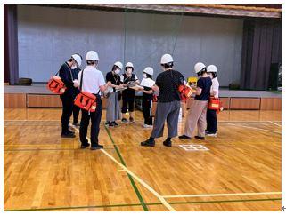 震度6強相当の地震を想定し、緊急対応の手順を確認しました。今年度も、二次避難での全体集合による密集を避けるため、児童生徒の参加は一次避難(その場での危険回避行動)のみを行いました。児童生徒は、地震発生の放送を聞き、教室の机の下へもぐったり、防災頭巾で頭を守ったりして、落ち着いて訓練に参加できました。