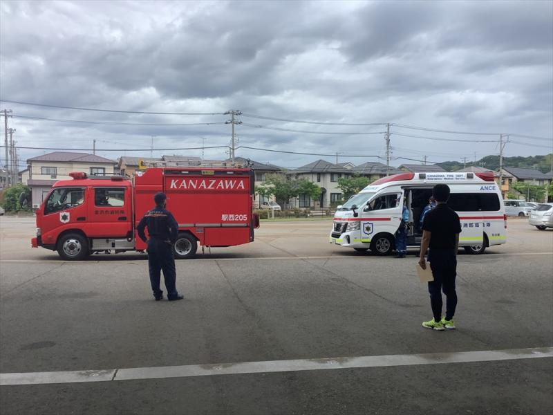 避難後には、小学部の児童を中心に消防車や救急車の見学や、教職員を対象とした水消火器による消火訓練も行い、防災意識を高める学習ができました。