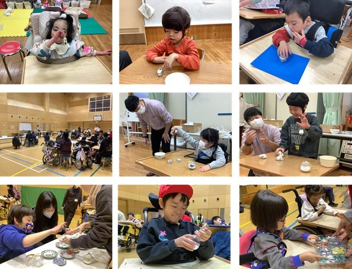 当日は、オーナメントを作る前に、本物の九谷焼のお皿に触れることができました。なかなか間近で見ることのない、歴史的にも芸術的にも価値ある美しい“本物”に触れることは、子ども達の心を動かし、創作意欲に火を付けました。子どもたちは、きらきら光る九谷焼のかけらに目を輝かせて思い思いに柄を選び、自分だけのクリスマスオーナメントを作ることができました。