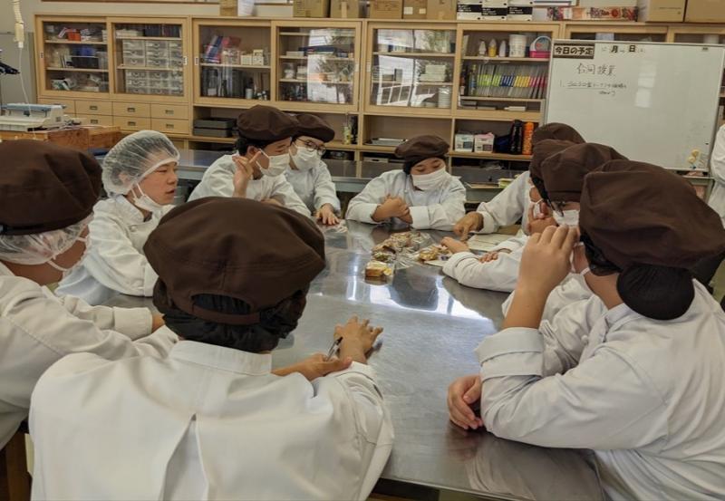 焼き菓子が冷めた後にグループで試食しました。「甘みが少ないな。」「ジャムが生地の甘さに負けているな。」という感想をもとに、改善したらよい点を話し合いました。再度それぞれの学校で改善案を取り入れて試作することになりました。