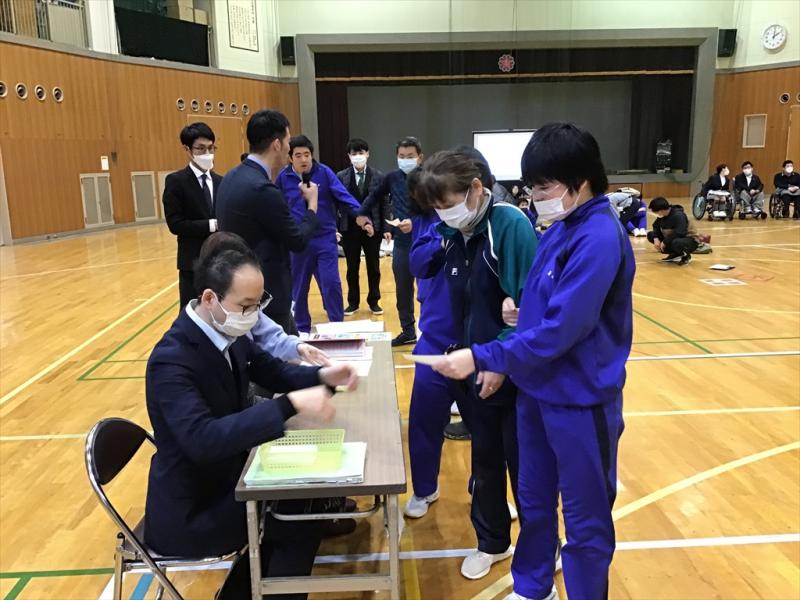 今回はキンボールの締めくくりとして、混合チームで対抗戦を行いました。各チーム、試合前には作戦ボードや動画で作戦を確認したり、ハーフタイム中は、前半戦について良かった点や改善点を話し合ったりしました。試合では、作戦通りに得点が決まると、拍手や「ナイス」といった声があがり、盛り上がる試合展開となりました。合同授業後の生徒たちからは、「楽しかった」、「また他のスポーツでも交流してみたい」などの感想も聞かれ、充実した合同授業となりました。