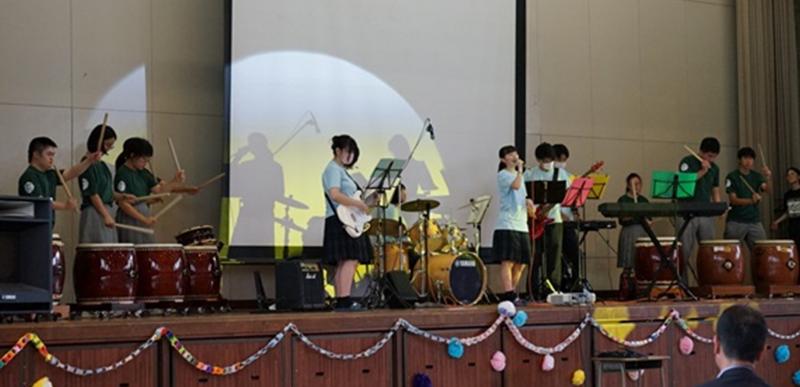 展示終了後、和太鼓サークルと金沢向陽高校軽音部の合同発表を鑑賞しました。二人は会場を盛り上げる金沢向陽高校の生徒とともに手拍子で舞台発表に聴き入っていました。