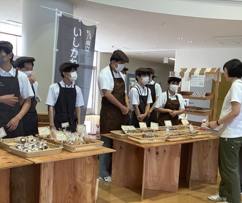 後半は、販売活動を行いました。第1回目の共同学習時に金沢向陽高生徒からフードデザインの焼き菓子を購入したいとの希望があったため、今回はまず向陽高生徒が買い物をしました。その後販売担当場所に分かれ、本校の生徒が向陽高生徒に接客やレジの方法を教えながら一緒に校内販売を行いました。向陽高生は初めての販売活動でしたが、大きな声を出しながら販売を行い、両校ともに楽しみながら行っていました。
