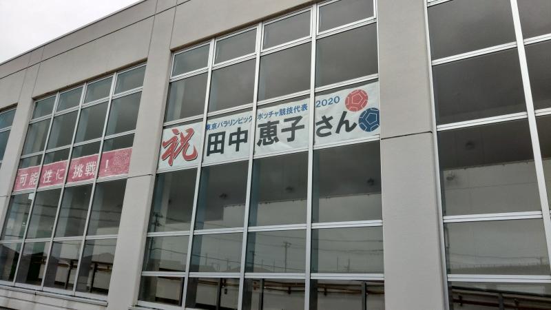 東京パラリンピックのボッチャ代表に選出された田中恵子先輩(本校中学部卒)の応援幕を貼り出しました!