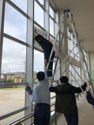 全員で協力して、脚立に乗っての高所作業。力を合わせて貼り出すことができました。