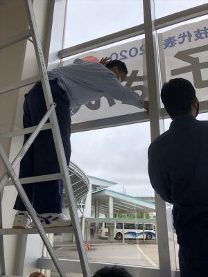 田中選手のメダル獲得を祝して、B高等部 環境整備班の生徒が横断幕を設置しました。高所での作業も協力し合い、安全に気を付けて行いました。