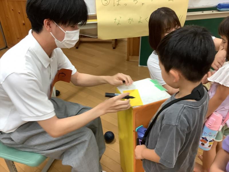 名札づくり、じゃんけんゲーム、ボッチャボールを使ったゲームを行いました。最初は緊張気味の年長児と生徒でしたが、次第に和やかな雰囲気になり、年長児たちの元気いっぱい活動する姿が見られました。「じゃんけんゲーム」で、手書きの「ゆうしょうメダル」を首にかけてもらった時の年長児の嬉しそうな様子を見て生徒たちは喜んでいました。