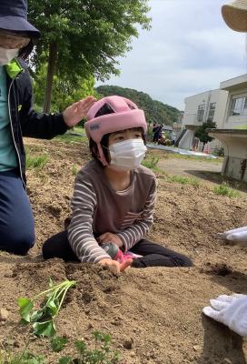 畑に行って、なえや土にたくさん触れて、なえ植えをしました。