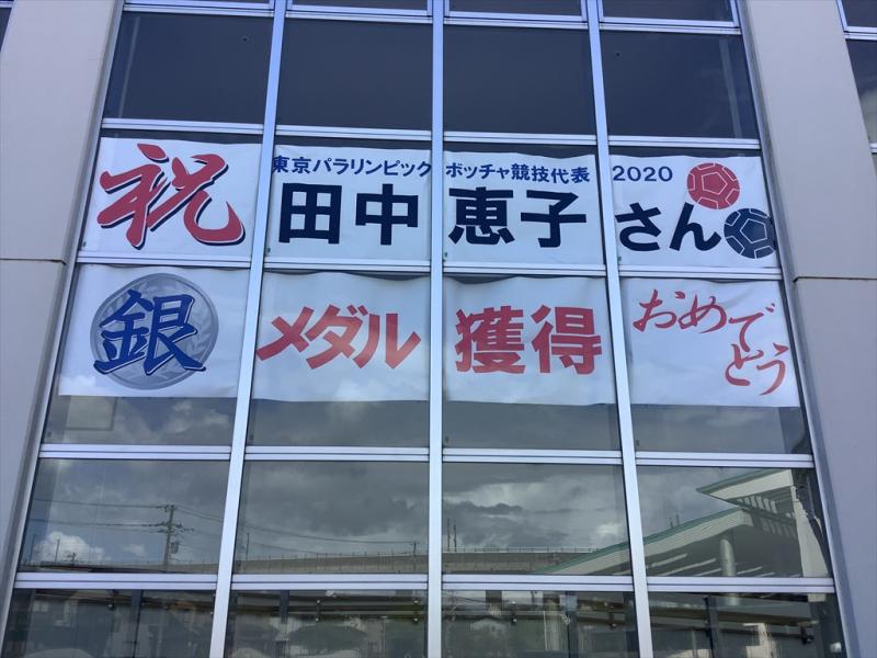 東京パラリンピックのボッチャ代表に選出された田中恵子先輩(本校中学部卒)の応援幕を貼り出しました!