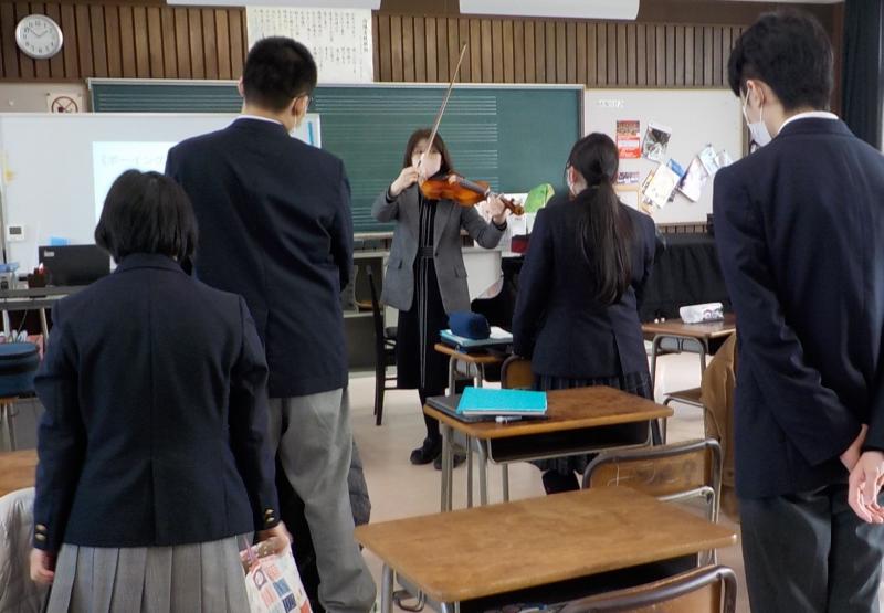 午後からは1年生の生徒4名が音楽の授業に参加し、バイオリンの演奏を体験してきました。向陽高校の生徒に演奏のポイント等を教えてもらいながら練習し、全員音を出すことができました。