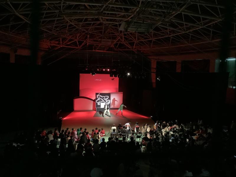 体育館に大きなステージが設営され、まさに本物の劇場が出来上がり、午前と午後の2回の公演で全校児童生徒が鑑賞しました。