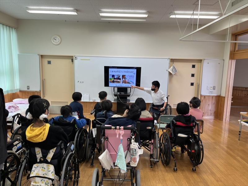 今回は油吸い取りパックを作業学習で作っている高等部生徒が本校小学部、中学部の児童生徒に作り方を説明する活動を行いました。高等部生徒は小学部や中学部の児童生徒にもわかりやすいように説明のスライドにルビをつけるなど、相手のことを考えた工夫を行っていました。高等部生徒からは、「大変だったけど、説明が伝わってうれしい」という声が聞かれました。小中学部の児童生徒は高等部の先輩から作り方を教えてもらうと、「早く作ってみたい」「難しそうだけどやりたい」などの感想を言っていました。これからの活動が楽しみです。
