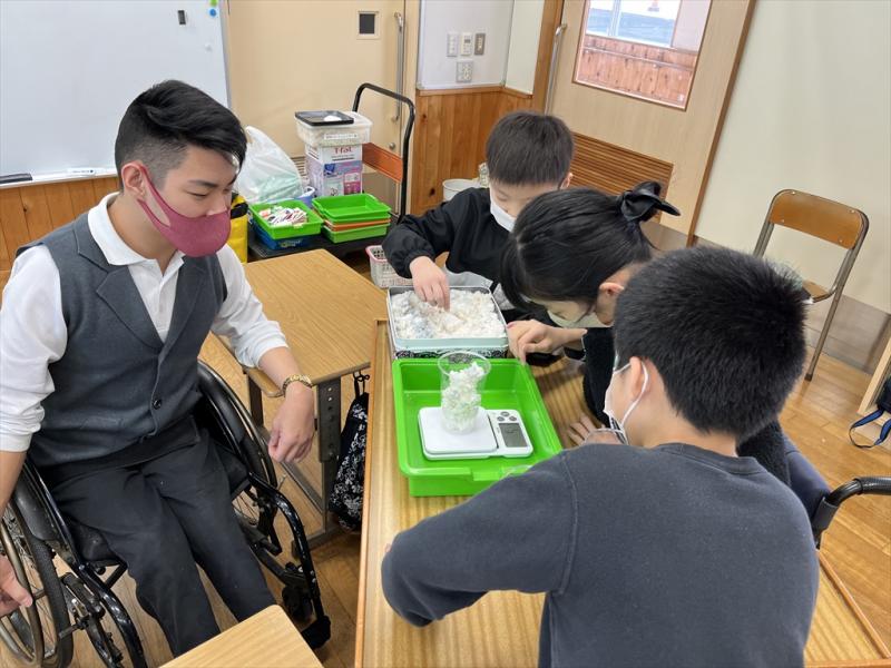 油吸い取りパックプロジェクトでは、本校肢体不自由教育部門小学部でも油吸い取りパックを製作します。作業学習で油吸い取りパックを作っている高等部の生徒が、小学部へ出張授業に行き、一緒に油吸い取りパックを作り、作成のコツや注意点を伝えました。