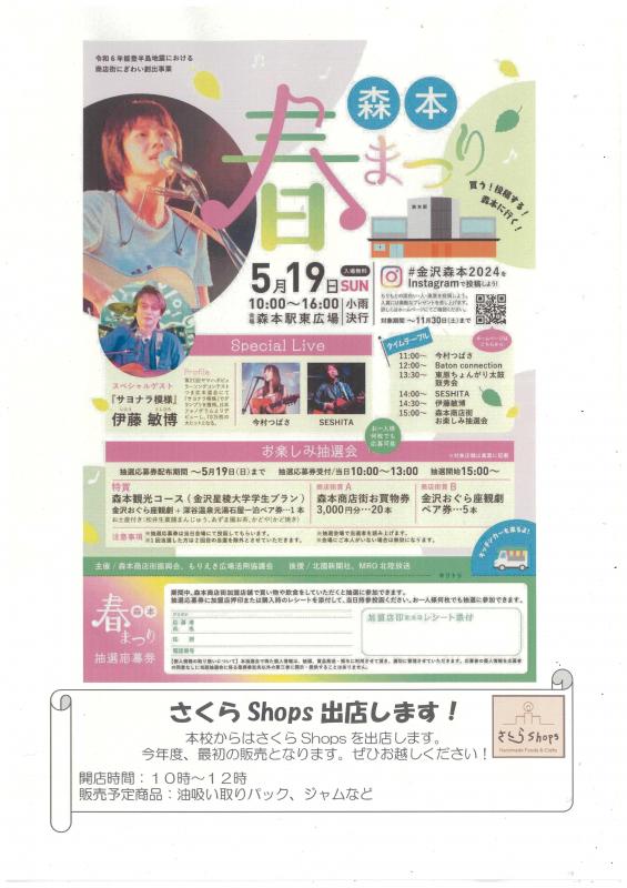 5/19(日)に森本駅前で開催される「森本春まつり」にて、A高等部の生徒が販売活動を行います。