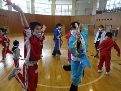 B小3・4年生は、12月4日にゲストティーチャーとして、金沢大学のよさこいサークル「彩(いろどり)」の方々をお招きし、よさこいソーランの授業を行いました。