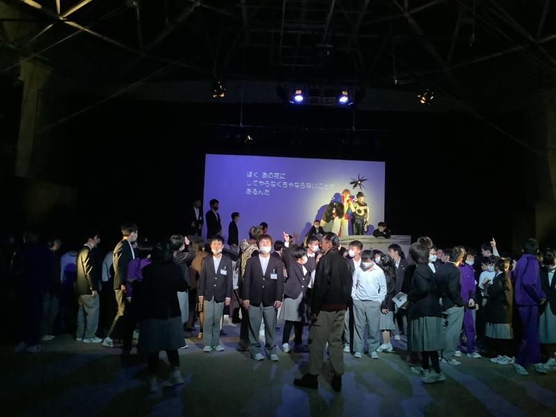 体育館に大きなステージが設営され、まさに本物の劇場が出来上がり、午前と午後の2回の公演で全校児童生徒が鑑賞しました。