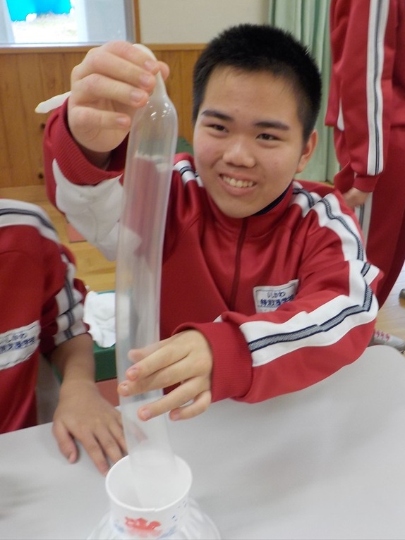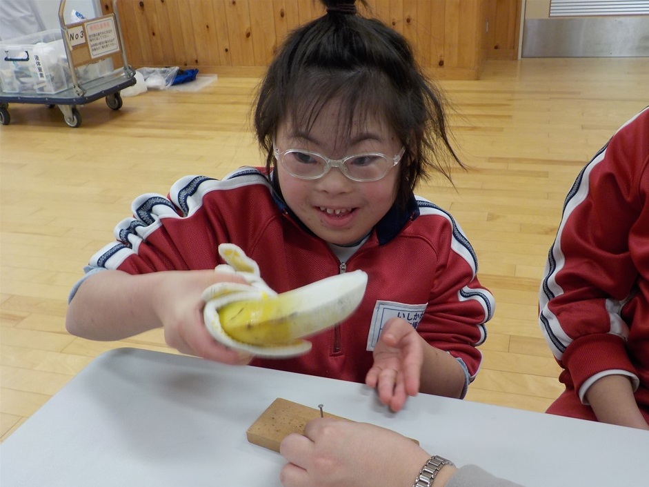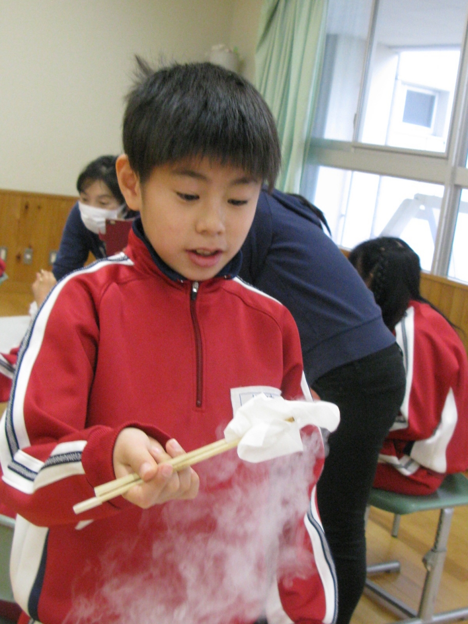 -200℃の冷たい液体窒素に花をつけるとパリパリと割れたり、凍ったバナナで釘打ちができたりと不思議な科学の世界を体験できました。どの子も興味津々で、活動に取り組みました。