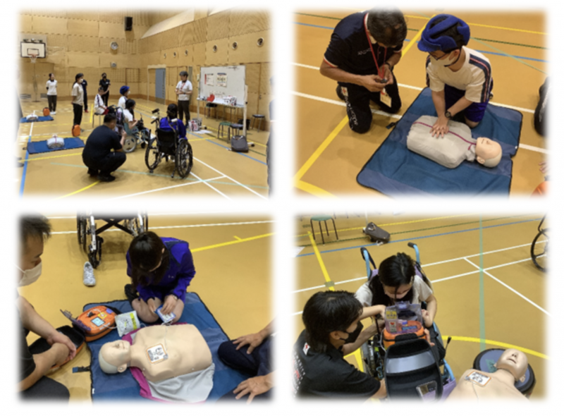 心肺蘇生法やAEDによる一次救命の大切さを教わってから、模型を使って使い方を学びました。心臓マッサージは行う位置や力加減を考えながら取り組んでいました。AEDは使い方を覚えようと、何度も練習していました。