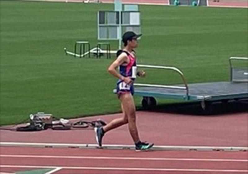 続いて男子5000mにも北島さんが出場しました。1時前で気温も上がり暑い中でのレースとなりました。スタートし、1000m過ぎから少しずつ集団から離れてきた選手を抜かしながら粘り強く走り、3000mから4000m過ぎの1番辛いところでも1周あたりのタイムが1秒ずつしか落ちませんでした。ラスト1000mでは徐々にペースを上げて走り抜き、初日に1500mを走り、同じ日に5000m競歩に出場し疲れが残った状況かつ暑い中でも自己ベストを更新することができました。