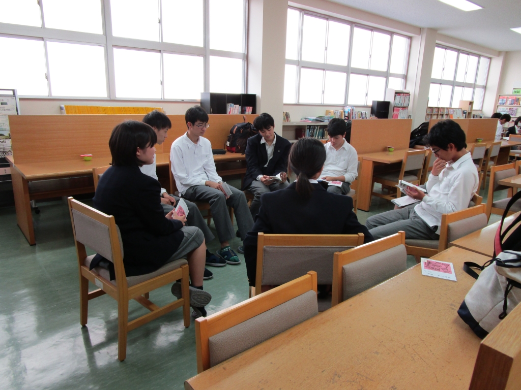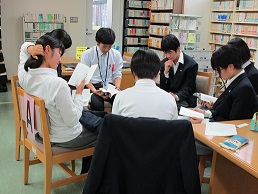 図書委員会では、今年も後期「校内読書会」を実施しました。6~7名の4班に分かれて、班長の司会で課題図書について、それぞれ意見を交わしました。一時間の議論の後、各班から代表者が議論内容を発表し合いました。今回のテキストは、卒業を迎える中学生が主人公の話なので、「自分の立場なら~」と、など活発に話し合いが行われました。