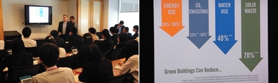 | 【研修内容】 ・米国で推進されているLEED(Leadership in Energy and Environmental Design)認証システムや豊かなまちづくり、グリーンビルディングの普及に対する取り組みについて、三井不動産から英語で講演を聞くとともに、英語で質疑応答や意見交換を行う。 |