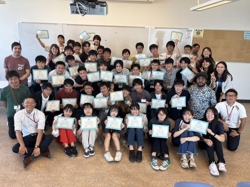 生徒40名と引率教員や講師を含めて50名くらいを前にスピーチするのは勇気がいることだったと思います。研修を通じて感じたこと、学んだことや、今年度、理数探究で取組んでいる自身の研究について、ユーモアを交えながら、聴衆をひきつけながら、ストリーを展開させていました。生徒たちのスピーチを聞いていて、この研修に対する意気込みや、気づいたこと、研修中の心の動き、本当はツラかったこと、ホストファミリーに対する思いなど、これまで気づかなかったことを知ることができて、生徒の成長、学んだこと、体得したことの大きさを感じました。