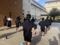指導は、基本体と呼ばれる姿勢や動作を実際に自分たちで実践しながらお互いにそれをチェックし、コーチなどから補足や意識してほしいことが細かく付け足されていくという流れで、1日かけて行われていきました。例えば、立った姿勢の指導の際に「上体を正しく保つ。うなじをまっすぐに伸ばす。」と書いてある部分について「身体計測で身長を計るときに、ちょっとでも高くしたいと背伸びする感じ」という説明をコーチからされ、男子の立ち姿が急にさまになったのには思わず笑いながら学びました。説明書きに書かれている文字通りだけでは分かりづらい部分もあり、そのような点が先輩から後輩にニュアンスとして伝えられていくのだなと思いました。