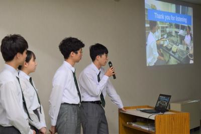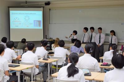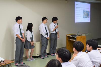 発表会は2会場で行い、理数科3年生が2グループに分かれてこれまでの研究成果を英語で発表しました。また、5~7限は理数科2年生が、7限は理数科1年生がオーディエンスとして参加し、ナノ生命科学研究所の先生方と共に質疑応答に参加しました。英語での発表でしたが、自分達の研究について堂々と発表する様子をみて、大変頼もしく感じました。