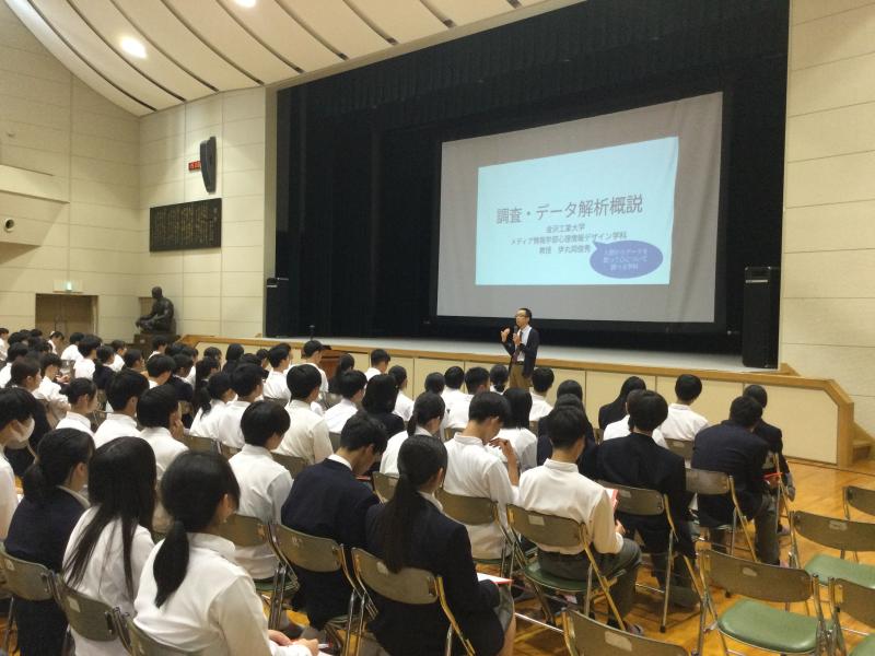 5月27日(火)7限の1年普通科9クラス対象の「SG探究基礎」において、金沢工業大学メディア情報学部教授の伊丸岡俊秀先生をお招きし、探究活動でのデータ収集と分析方法についての入門講座を実施しました。