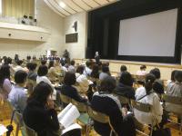 講堂の舞台ではESSが英語劇の練習していました。自分たちの演技に対して顧問やALTからアドバイスを受けています。金曜日に女性センターで大会が行われます。規定時間の15分に収まるように、調整は明日も続きます。