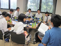 6・7限は場所を移動し、中間ディスカッションを行いました。今度は理数科の3年生も参加し、フリーディスカッション形式で議論しました。実験器具や動画を使って説明する班もあり、様々な工夫がみられました。