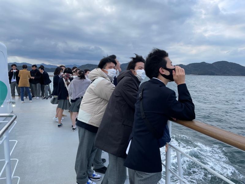 その後、うずしお観潮船に乗船し、鳴門海峡周辺の約40分のクルーズを楽しみました。生徒たちは、大鳴門橋下に発生する渦潮に歓声をあげ、スマホを手にその様子をビデオや写真におさめていました。