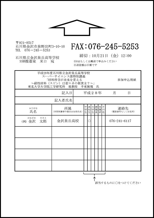 今回の講義は、県内中学・高校の生徒さん及び教員の方、保護者の方も参加対象といたします。参加希望の方は下記の申し込み用紙に必要事項を記入の上、以下の連絡先へFAXまたは郵送でご提出ください。