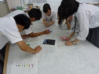 8月23日(火)は泉野校下町会連合会理事副会長の北浦 勝 氏による、防災倉庫や備蓄倉庫見学と野外調査を行い、24日(水)この調査を元に防災マップを作製し、発表を行いました。