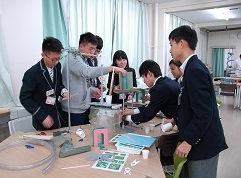 学校紹介の様子 協力して装置のパーツを作製 最終的に1つの装置が完成