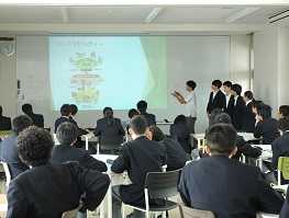 11月16日(金)に、CS人間科学の授業の一環として環境問題をテーマにしたプレゼン大会を開催しました。生物多様性の保全から考えた里山利用や、ゴミ処理への新たなアプローチなど、8班それぞれが人間科学の時間で調べた内容について、パワーポイントを用いて口頭発表を行いました。