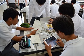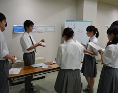 6・7限は場所を移動し、中間ディスカッションを行いました。今度は理数科の3年生も参加し、フリーディスカッション形式で議論しました。実験器具や動画を使って説明する班もあり、様々な工夫がみられました。